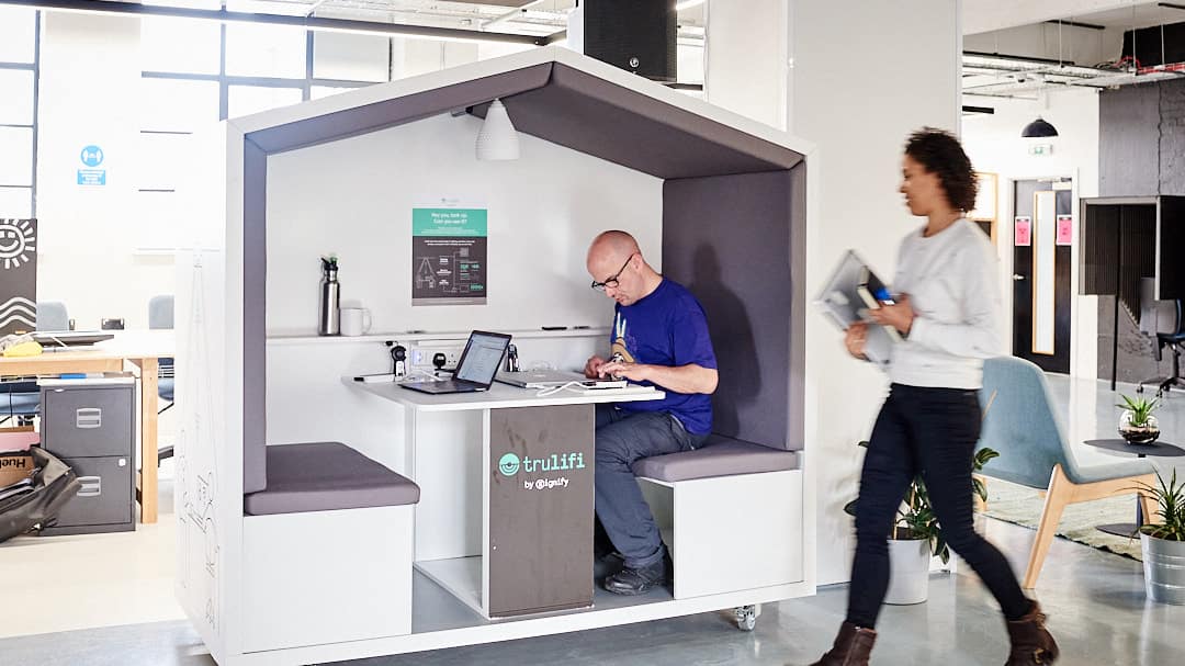 The #TrulifiNook has made its way into the Creative Works space in London for a three week long showcase of LiFi, super stable and secure internet via light waves, and Nook Pods a quiet and focussed environment for productivity. The hub provides a spot for independent professionals to connect effortlessly, with the ability to control their immediate environment, finding uninterrupted space to knuckle down and deliver.